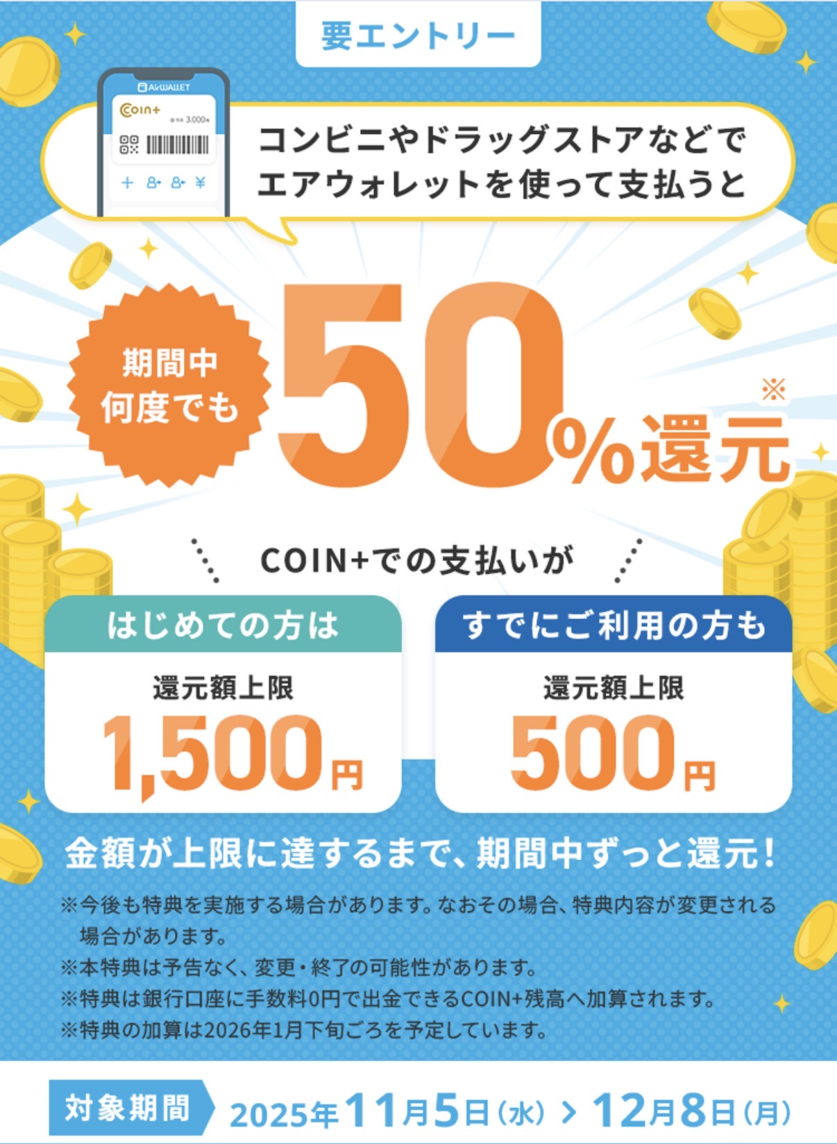 - 内容:対象店舗(ローソン、ミニストップ、無印良品、ダイコクドラッグ、キャンドゥなど)で COIN+決済 を行うと、50%が還元されます。