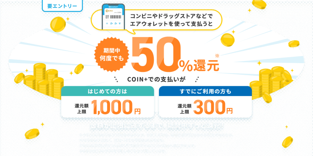 COIN+が使えるコンビニやドラッグストアなどで支払いを行うと、期間中何度でも50%還元されるキャンペーンです。