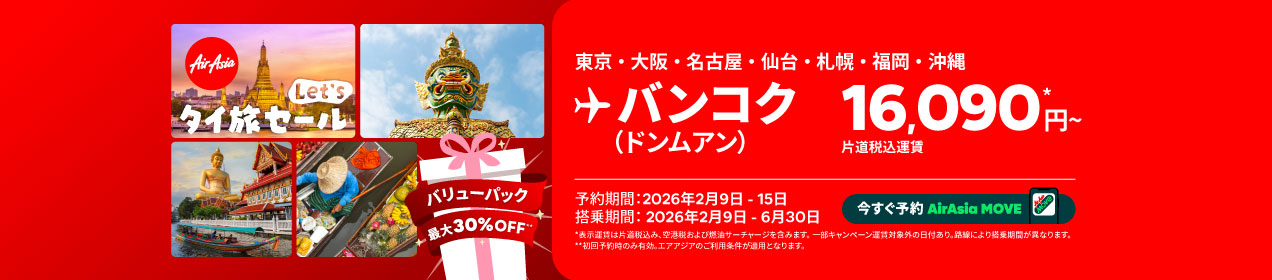 エアアジアが、国際線航空券の期間限定タイムセールを実施します。今回のセールでは、バンコク行きの航空券が片道14,990円からというお得な価格で販売されます。販売期間は2025年8月25日(月)から8月 ...