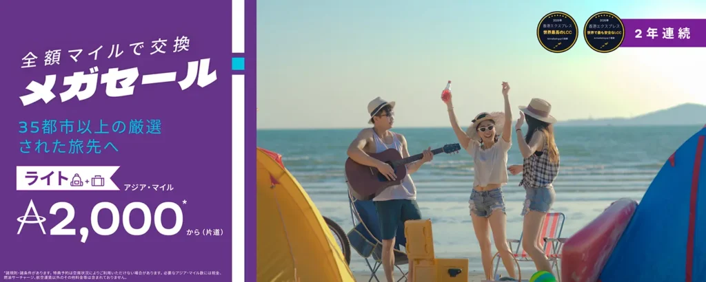 香港のLCC、香港エクスプレス(HK Express)にて、アジア・マイルを使って特典航空券におトクに交換できる「全額マイルで航空券に交換 メガセール」が開催されています。