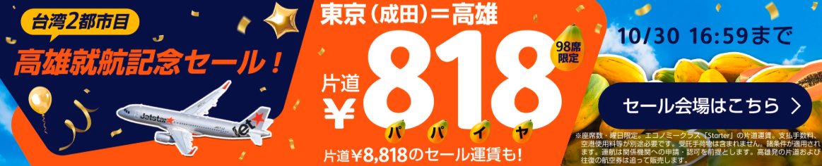 |  高雄就航記念セール | 10/24 12:00 〜 10/30 16:59 (10/26 〜 3/28) | 高雄 台北 マニラ |