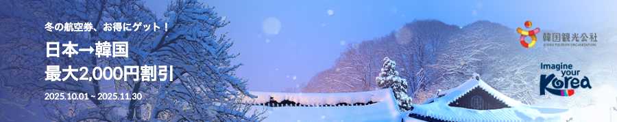|  日本→韓国最大2,000円割引 | 10/1 〜 11/30 23:59 (12/1 〜 2/28) | ソウル 釜山 |