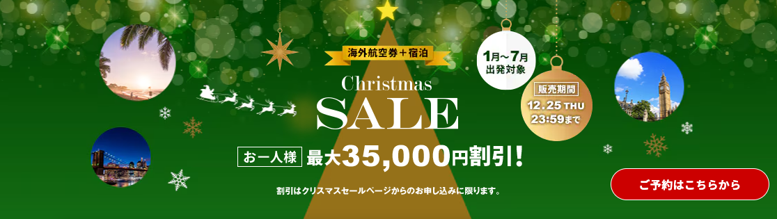 12/15 〜 12/26 (12/15 〜 4/24) | クリスマスセール | ▶︎成田発 ・ソウル:8,000円~ ・マニラ:11,500円~ ・バンコク:16,500円~ ・ホノルル:20,000円~ ・バンクーバー:28,950円~ ・ロサンゼルス:29,250円~ |