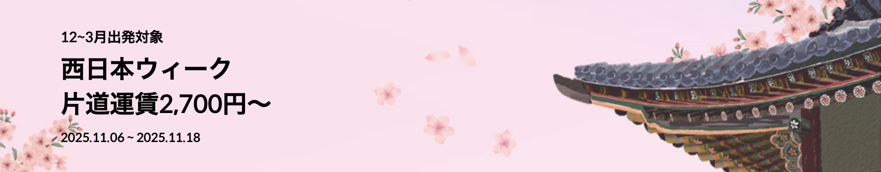 予約期間は 2025年11月6日(木)~11月18日(火)。対象となる出発期間は 2025年12月1日(月)~2026年3月28日(土) までの冬~春シーズン。この期間、福岡・大阪・広島発の人気路線 が片道わずか 2,700円~ という破格で販売されています。