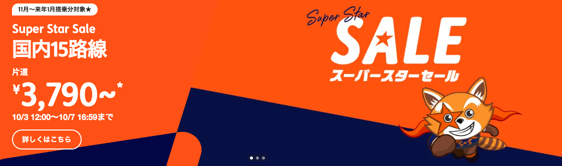 今回の「Super Star Sale」は、秋冬の国内旅行を格安で楽しむチャンスです。最安3,790円から、東京・大阪・名古屋・札幌発着の人気路線がセール対象となっており、旅行好きはもちろん、年末年始の帰省や冬の観光にもうってつけ。