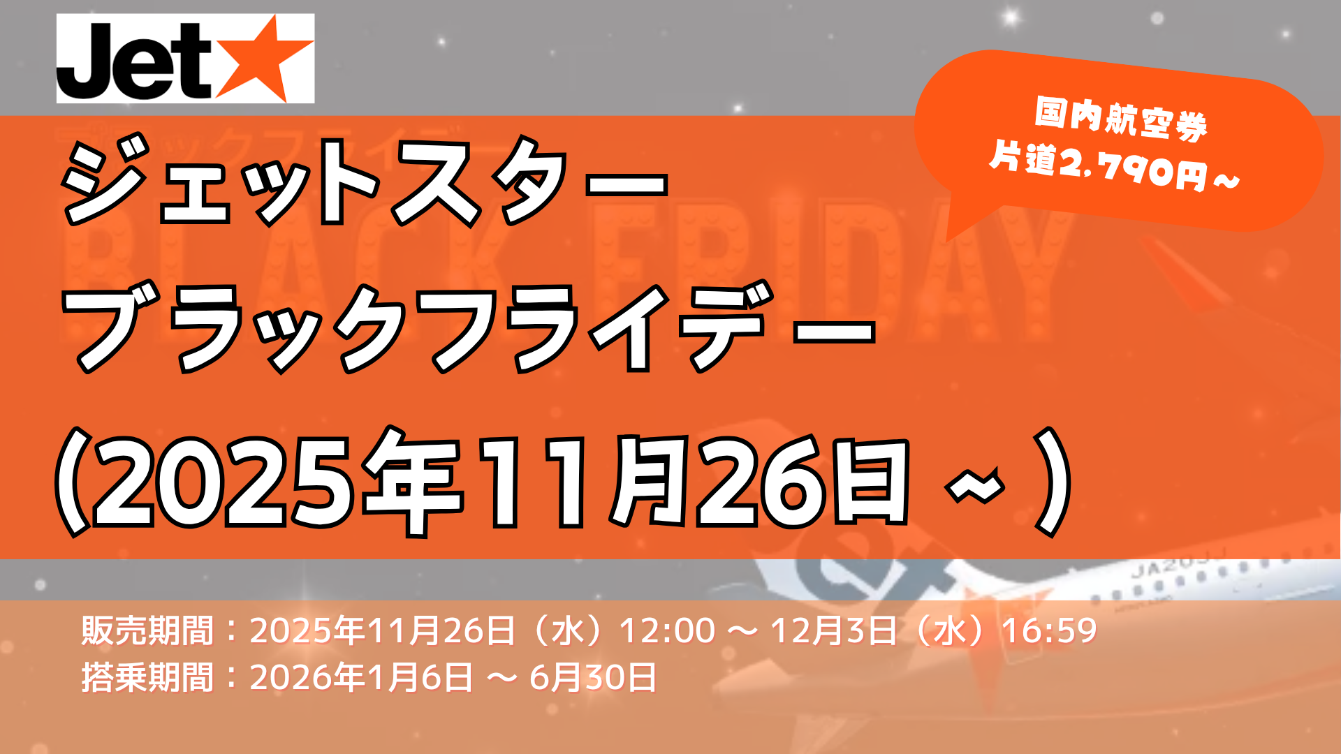 ジェットスターBLACK FRIDAY 2025|国内2,960円〜&国際線8,696円〜!全路線セール価格まとめ 2025年もいよいよやってきました、年に一度の「Jetstar BLACK FRIDAYセール」。 今年は 日本国内・アジア・オーストラリア全路線が対象 となる、過去最大級のラインナップ。最低価格は 国内線 片道2,960円〜、国際線 片道8,696円〜 と、例年通り圧倒的な安さが揃いました。 販売期間は 2025年11月26日(水)12:00〜12月3日(水)16:59 のわずか8 ...