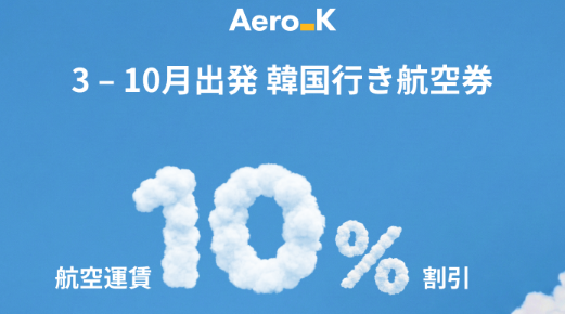 【2026年2月23日〜】エアロK、韓国行き航空券が10%OFFのプロモーションを開催!10月末までたっぷり使える割引コードを配布