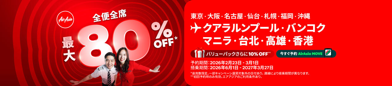 アジア旅行がかつてないほど身近に!LCC最大手のエアアジア(AirAsia)は、2026年2月23日より「全便全席最大80%OFF」となる大規模セールをスタートしました。 今回のセールは、日本各地(東 ...