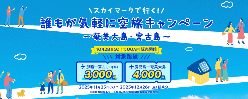 スカイマーク株式会社は、鹿児島県および沖縄県の地域活性化を目的とした特別企画、「誰もが気軽に空旅キャンペーン ~奄美大島・宮古島~」 を発表しました。