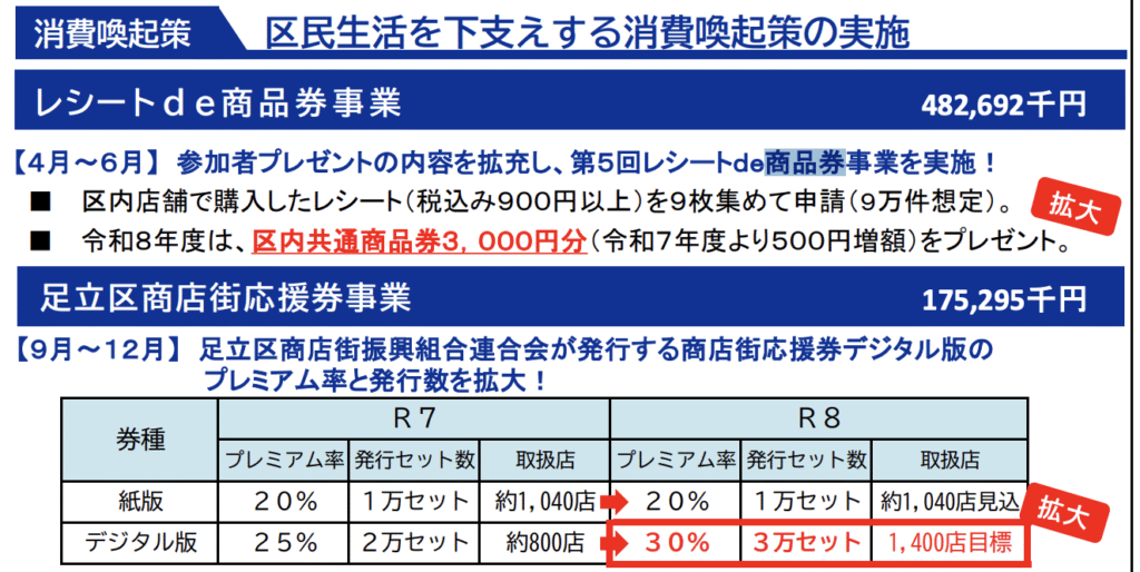 足立区では、物価高騰に直面する区民生活を支え、地域経済の活性化を強力に推進するため、令和8年度の「足立区商店街応援券」において、デジタル版のプレミアム率や発行規模を大幅に引き上げる計画です。
