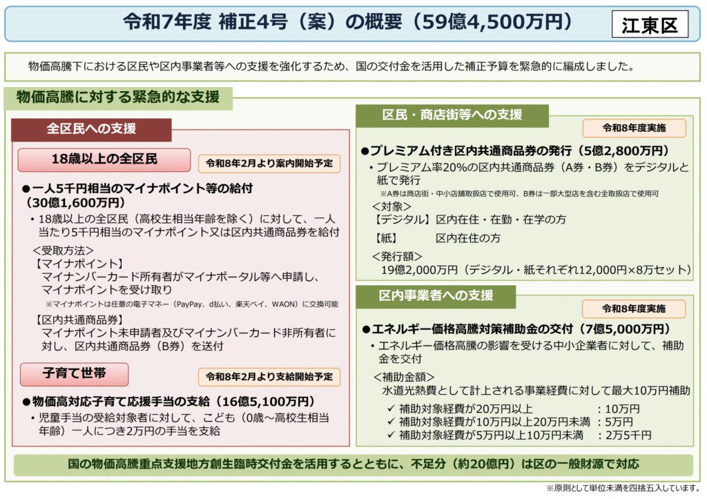 江東区は、物価高騰の影響を受ける区民や区内事業者への支援を強化するため、令和8年度の実施を目的とした「プレミアム付き区内共通商品券の発行」を予算案に計上しました。
