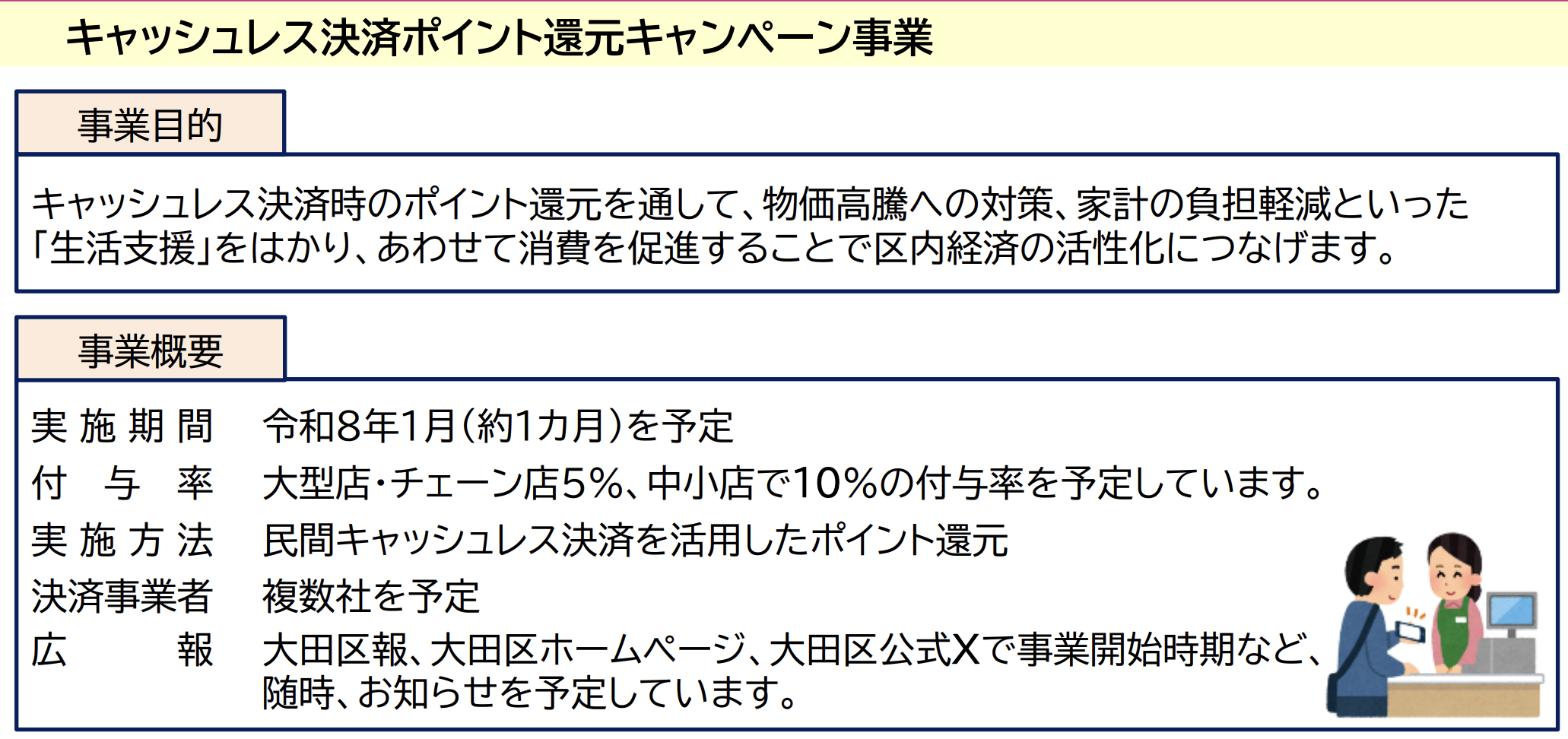 大田区は、物価高騰対策と地域経済の活性化を目的に、「キャッシュレス決済ポイント還元キャンペーン事業」を令和8年1月に約1カ月間実施します。