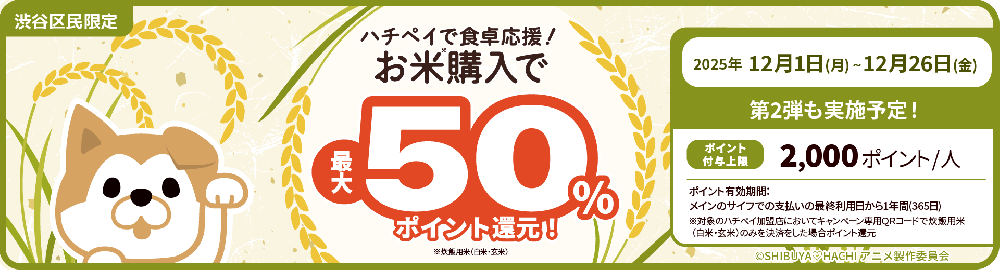 渋谷区のキャッシュレス決済「ハチペイ」では、食卓応援企画として お米購入で最大50%ポイント還元キャンペーン を2025年12月1日(月)~12月26日(金)に開催します。