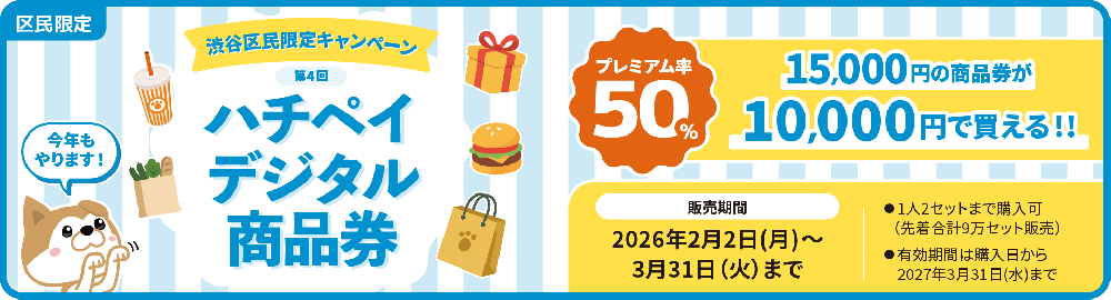 渋谷区では、区民限定の還元事業として、プレミアム率50%を誇る「ハチペイデジタル商品券(第4回)」を先着販売します。10,000円の支払いで15,000円分の買い物ができる非常に強力なキャンペーンです。