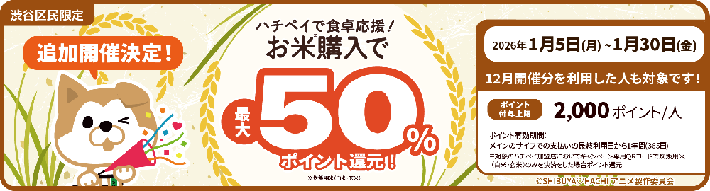 渋谷区のキャッシュレス決済「ハチペイ」では、食卓応援企画として お米購入で最大50%ポイント還元キャンペーン を2025年12月1日(月)~12月26日(金)、2026年1月5日(月)〜1月30日(金)に開催します。